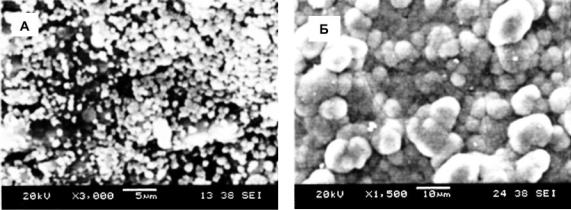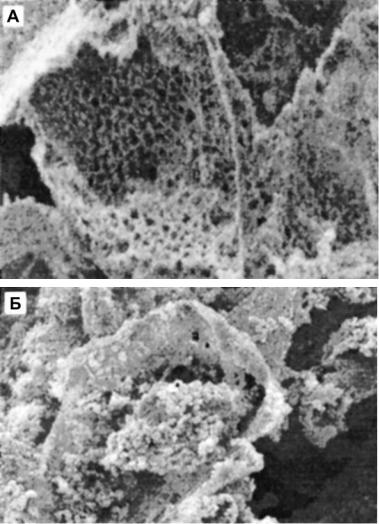 Рис. 4.13. Образование костеподобного слоя на подложке из композита «ПОА-хитин» (20 вес. % ПОА): А – 2 дня, Б – 72 дня эксперимента (Wang et al., 2001).