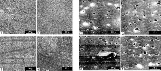 Рис. 4.14. Топография поверхности пленок, изготовленных из ПОБ (А) и ПОБ-со-ПОВ (Б): 1 – исходная, 2 – обработка этанолом, 3 – сухожаровая стерилизация,