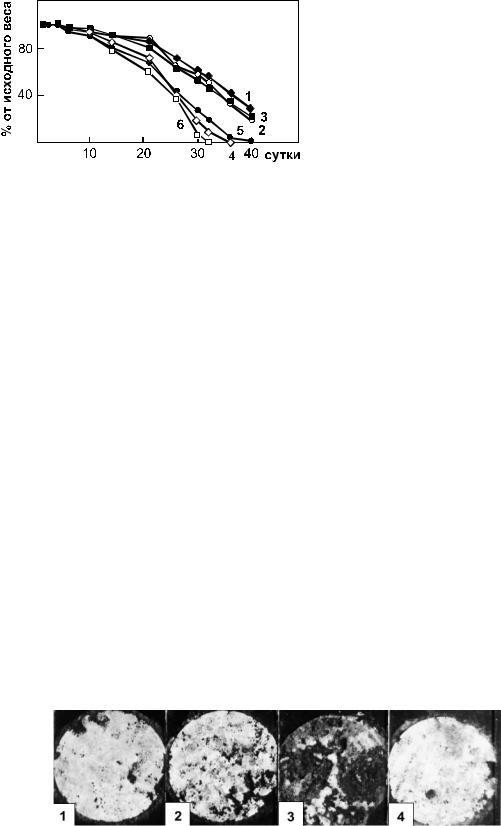 Рис. 5.1. Динамика уменьшения массы пленок различных образцов ПОА, в ходе их разрушения в почве. 1–3 – ПОБ, 4–6 – ПОБ-со-ПОВ. Характеристика образцов в таблице 5.1 (Волова с соавт., 1996)