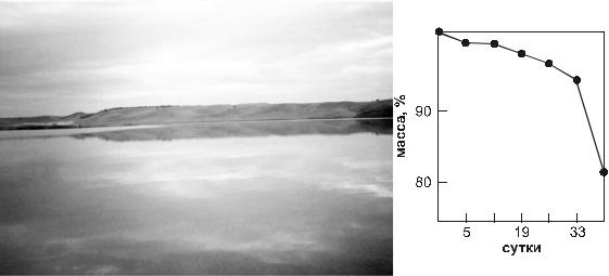 Рис. 5.3. Пруд Бугач, лето 2001 г. (фото М. И. Гладышева). Справа – динамика убыли массы пленок из ПОБ-со-ПОВ (Волова, неопубикованные данные).