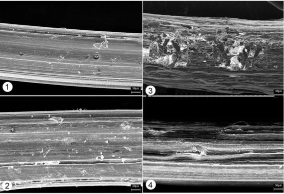 Рис. 5.4. РЭМ снимки поверхности полимерных нитей из ПОБ-со-ПОВ в ходе деградации in vivo: 1 – исходная, 2 – 90, 3 – 120 и 4 – 180 суток.