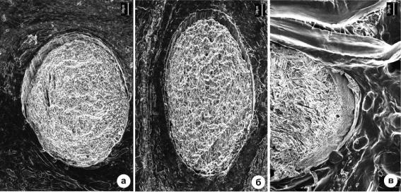 На срезе после 14 сут. имплантации (рис.5.5а) видны единичные микротрещины. Спустя 120 и180 сут. после имплантации состояние нитей принципиально не изменилось (рис. 5.5б, в). Отсутствие усиления дефектов структуры нити в объеме на течение 180 сут. свидетельствует в пользу предположения о том, что происхождение микротрещин и пор скорее всего связано с неравномерным травлением щелочью отдельных микрообластей нитей, возможно, межфибриллярного аморфного матрикса, так как известно, что ПОА гидролизуются в щелочной среде.