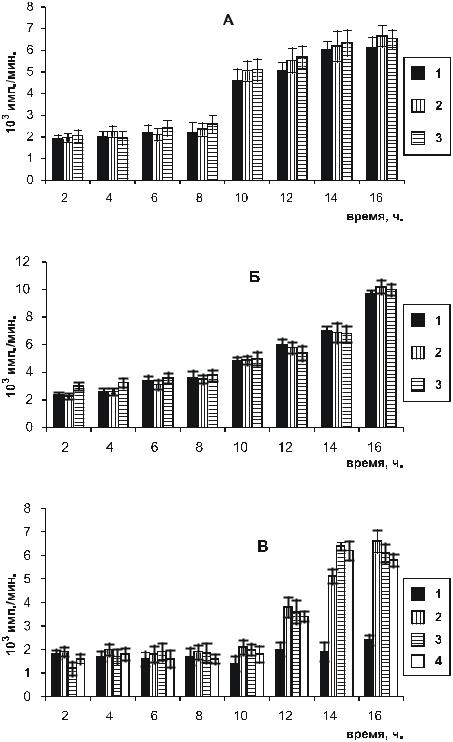 Рис. 6.1. Кинетика включения 3Н-тимидина в фибробасты мыши линии NIH 3T3 (А), клетки эндотелия (Б) и гепатоциты (В) в среде с 10 % ЭТС, культивируемых на: