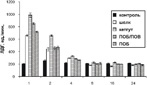 Изменение активности ЛДГ отражает, как известно, биохимические изменения в тканях, имеющие место на стадии повреждения и связанные, наряду с высвобождением кислых липидов и их перекисным окислением, с активацией реакций гликолиза, которые сопровождаются накоплением в тканях молочной кислоты и ацидозом (Воспаление, 1981; Шехтер, Серов,1995).