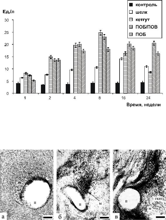 Через 4 недели после операции толщина фиброзных капсул вокруг имплантатов из ПОБ и ПОБ-со-ПОВ увеличилась до 172.23 ± 13.64 и 169.67 ± 5.97 мкм. Это было сопоставимо с ТК вокруг шелка и в 2 раза меньше, чем ТК вокруг кетгута. Продолжало увеличиваться количество активных, с большим количеством выростов и клеточных лизосомальных структур макрофагов (до 11–12 в п/зр) и ГКИТ, а также активность КФ в них (рис. 6.13в).