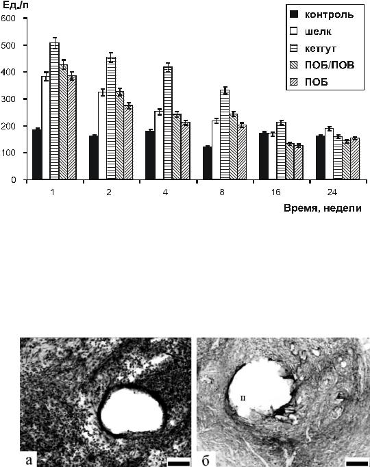 Микроскопическая картина в месте имплантации ПОБ и ПОБ-со- ПОВ на 7 сутки после операции характеризовалась незначительным отеком тканей вокруг имплантированных нитей и единичными тонкими зонами некроза (рис. 6.11). Шовные нити были окружены преимущественно макрофагами и лимфоцитами, а также нейтрофилами и фибробластами. Отмечено начало формирования вокруг имплантатов фиброзных капсул. Реакция тканей вокруг экспериментальных нитей из ПОА по силе воспаления была сопоставима с реакцией тканей на шелк и значительно менее выражена по сравнению с реакцией на кетгут.