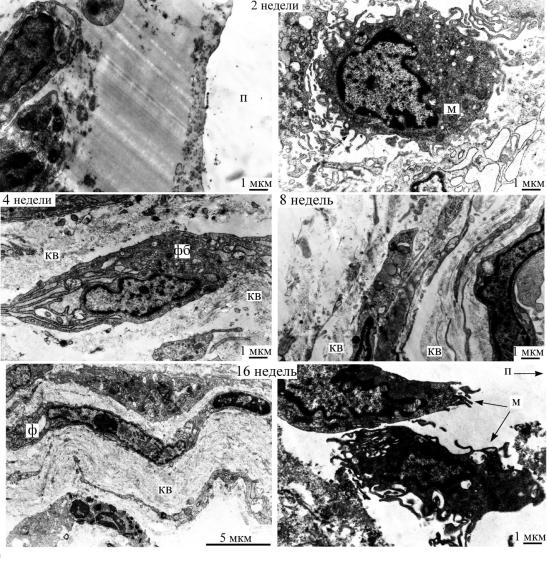 Рис. 6.16. Ультратонкие срезы участков фиброзных капсул, формирующихся вокруг имплантированных нитей из ПОА на разных сроках.