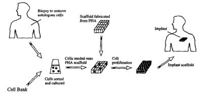 Техника получения биоактивных имплантатов и биоискусственных органов включает: 1) изготовление биосовместимых и биоабсорбируемых конструкций (инкубаторов) для культивирования аутологических клеток пациента или клеток, взятых из банка, 2) выращивание клеток и формирование тканей in vitro и 3) последующую имплантацию полученных конструкций пациенту (рис. 7.2).