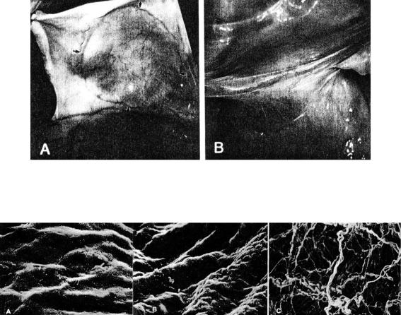 Группа сотрудников Медицинского университета и отделения торакальной и сердечно-сосудистой хирургии госпиталя г. Ланда в Швеции под руководством профессора Малма исследовала возможность снижения осложнений, имеющих место после операций на открытом сердце, за счет имплантирования полимерных лоскутов из ПОБ в качестве временного перикарда (Malm et al., 1992a, b). Животных (были взяты овцы) наблюдали в течение 2.5 лет относительно контроля (у животных после иссечения участка перикарда перикардиальная полость была оставлена открытой). В ходе опыта у экспериментальных животных развития спаечного процесса между сердцем и грудиной не отмечено (рис. 7.3). Показано, что в ответе тканей на имплантацию ПОБ принимали участие многоядерные макрофаги. По мере формирования новой ткани на фоне деструкции полимерного лоскута в многоядерных макрофагах было отмечено наличие включений частичек ПОБ. С применением СЭМ выявлено, что на перикардиальной поверхности регенерированной ткани со стороны сердца сформировался мезотелеподобный слой, который полностью покрывал подлежащий слой коллагена.
