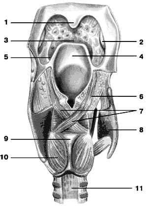 1 – язычок; 2 – небная миндалина; 3 – корень языка; 4 – надгортанный хрящ; 5 – боковая складка слизистой оболочки; 6 – черпалонадгортанная мышца; 7 – поперечная черпаловидная мышца; 8 – щитовидный хрящ; 9 – перстневидный хрящ; 10 – задняя перстнечерпаловидная мышца; 11 – перепончатая стенка трахеи.