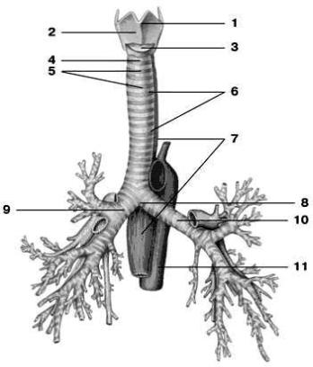 1 – гортанный выступ, кадык; 2 – щитовидный хрящ; 3 – перстнещитовидная связка; 4 – перстнетрахеальная связка; 5 – дугообразные трахейные хрящи; 6 – кольцевые связки трахеи; 7 – пищевод; 8 – раздвоение трахеи; 9 – главный правый бронх; 10 – главный левый бронх; 11 – аорта.