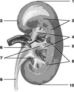 1 – extremitas superior;2 – margo medialis;3 – cortex renis;4 – caluces renales minores;5 – margo lateralis;6 – pelvis renalis;7 – caluces renales majores;8 – medulla renis;9 – ureter; 10 – extremitas inferior;