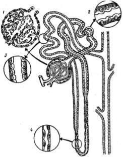 1 – клубочек; 2 – проксимальный отдел канальца; 3 – дистальный отдел канальца; 4 – тонкий отдел петли Генле.