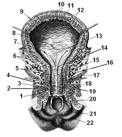 1 – bulbus vestibuli; 2 – ostium urethrae extrnum; 3 – tunica spongiosa; 4 – tunica mucosa; 5 – tunica muscularis; 6 – plexus venosus vesicalis; 7 – ostium ureteris; 8 – plica interureterica; 9 – vesica urinaria; 10 – tunica muscularis; 11 – tela submucosa; 12 – tunica mucosa; 13 – trigonum vesicae; 14 – ostium urethrae internum; 15 – crista urethralis; 16 – urethra feminina; 17 – m. levator ani; 18 – m. transversus perinei profundus; 19 – lacunae urethrales; 20 – ostium vaginae; 21 – labium minus pudendi; 22 – labium majus pudendi.
