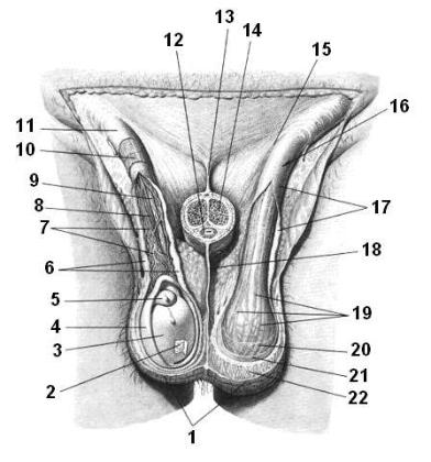 1 – cutis; 2 – tunica albuginea; 3 – tunica vaginalis testis (lamina vaginalis); 4 – tunica vaginalis testis (lamina parietalis); 5 – epididymis; 6 – fascia spermatica interna; 7 – plexus pampiniformis; 8 – a. testicularis; 9 – ductus deferens; 10, 19 – m. cremaster; 11, 20 – fascia cremasterica; 12 – corpus spongiosum penis; 13 – lig. suspensorium penis; 14 – corpus cavernosum penis; 15 – anulus inguinalis superficialis; 16 – funiculus spermaticus; 17 – fascia spermatica externa; 18 – septum scroti; 21 – fascia spermatica externa; 22 – tunica dartos.