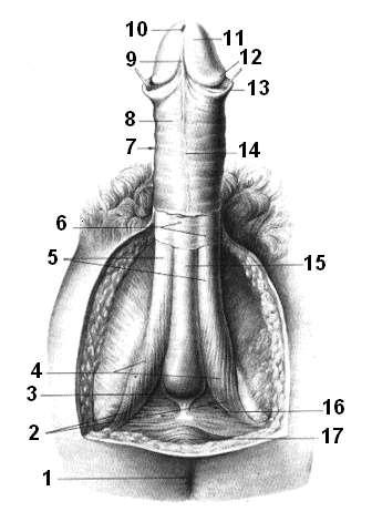 1 – anus; 2 – radix penis; 3 – bulbus penis; 4 – m. ishhiocavernosus; 5 – corpora cavernosa penis; 6 – fasciae penis superficialis et profunda; 7 – corpus penis; 8 – integumentum commune; 9 – freniculum preputii; 10 – ostium urethrae externum; 11 – glans penis; 12 – corona glandis; 13 – preputium penis; 14 – raphe penis; 15 – corpus spongiosum penis; 16 – m. transversus perinei profundus; 17 – m. sphincter ani externus.