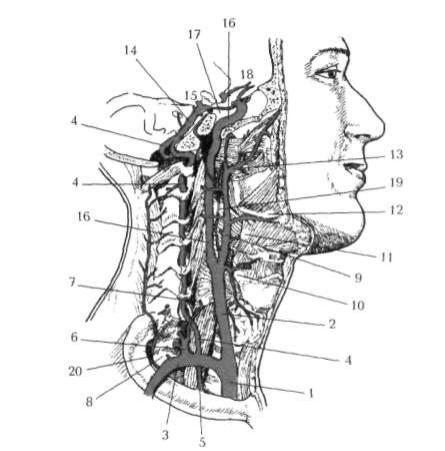 – arteria basilaris; 15 – arteria cerebri posterior; 16 – arteria carotis interna; 17 – arteria communicans posterior; 18 – arteria cerebri anterior; 19 – arteria pharyngea ascendens; 20 – arteria transversa colli.