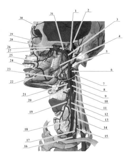 1 – а. transversa faciei; 2 – а. temporalis superficialis; 3 – a. maxillaris; 4 – а. alveolaris inferior; 5 – а. auricularis posterior; 6 – n. glossopharyngeus; 7 – n. hypoglossus; 8 – а. occipitalis; 9 – а. pharyngea posterior; 10 – a. carotis interna; 11 – n. vagus; 12 – sinus caroticus; 13 – а. carotis communis sinistra; 14 – n. phrenicus; 15 – truncus tbyreocervicalis; 16 – a. subclavia sinistra; 17 – a. vertebralis; 18 – glandula thyroidea; 19 – a. thyroidea superior; 20 – a. carotis interna; 21 – a. lingualis; 22 – a mentalis; 23 – a. facialis; 24 – a. labialis inferior; 25 – a. labialis superior, 26 – a. sphenopalatina; 27 – a. infraorbitalis; 28 – a. angularis; 29 – a. dorsalis nasi; 30 – a. supraorbitalis; 31 – a. meningea media.