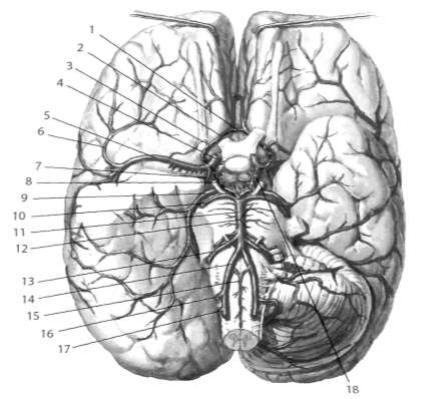 1 – a. communicans anterior; 2 – a. cerebri anterior; 3 – a. recurrens; 4 – a. carotis interna; 5 – a. cerebri media; 6 – a. orbitofrontalis laten(nasoorbitalis); 7 – a. choroidea anterior; 8 – a. communicans posteri 9 – a. cerebri posterior; 10 – a. superior cerebelli; 11 – a. basilaris; 12 – pontis; 13 – a. inferior posterior cerebelli; 14 – a. vertebralis; 15