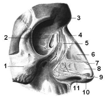 1 – os zygomaticum; 2 – os lacrimale; 3 – os frontale; 4 – os nasale; 5 – processus frontalis maxillae; 6 – cartillago nasi lateralis; 7 – cartilago nasi accessoria; 8 – cartilage alaris major (crus lateralis); 9 – cartilagines alaris minores; 10 – integumentum commune; 11 – naris.