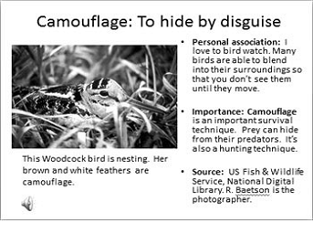 example of a multimedia glossary item for camouflage, a word from the science
