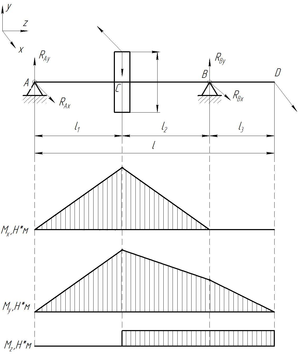 Строим эпюру изгибающих моментов относительно оси Y в характерных сечениях (рисунок 9.3)