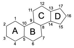 Кольца, составляющие скелет циклопентанпергидрофенантрена, принято обозначать латинскими буквами А, В, С и D. Порядок нумерации сложился исторически в ходе исследования их строения. Углеродные атомы колец ABD нумеруют против часовой стрелки, а атомы кольца С – по часовой стрелке. После нумерации атомов ядра нумеруют углеродные атомы ангулярных групп – С18 и С19, а затем – боковой цепи в 17 положении. Для обозначения пространственного положения заместителей служат буквы α и β. В названии стероидных соединений эти буквы ставят после номера асимметрического центра, в котором находится этот заместитель. Например, буква α обозначает транс-положение заместителя по отношению к ближайшей ангулярной метальной группе, а буква β – цис-положение по отношению к этой же группе. На графическом изображении молекулы стероида сплошной линией соединяют ангулярные метальные С18 и С19, β- заместители, а α-заместители – при помощи пунктирной линии.