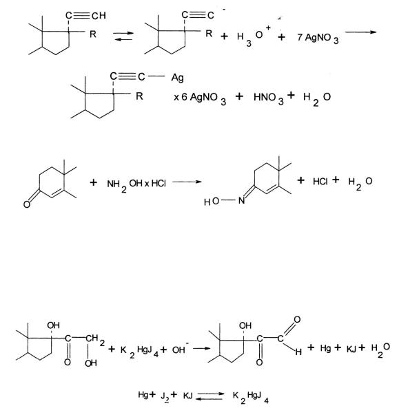 – этинильной группе, используя ее способность образовывать двойные соли с нитратом серебра. Выделившееся эквивалентное количество азотной кислоты оттитровывают ОДМ раствором NaOH, точку эквивалентности определяют потенциометрически или с помощью индикатора бром крезолового синего (Мм эквивалента = Мм).