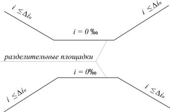 Разделительные площадки имеют нулевой уклон и располагаются между элементами продольного профиля, направленными навстречу друг другу. Примеры расположения приведены на рис. 11. Длина разделительной площадки не должна превышать рассчитанную по формуле (2).