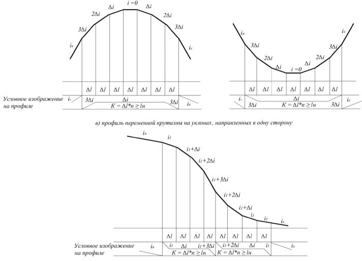 а – профиль «на горбе», б – профиль «в яме», в – профиль переменной крутизны на уклонах, направленных в одну сторону