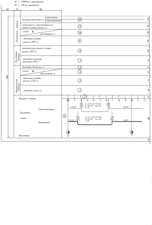 3.Продольный профиль участка пути составляется в масштабах 1:10000 по горизонтали, 1:100 по вертикали. Сетка («Боковик») продольного профиля показана на рис. 1. Боковик выполняется в левой нижней части чертежа без отступа от стандартных рамок. Пример проектирования реконструкции продольного профиля приведен в приложении Б. Боковик продольного профиля для дипломного проектирования выполняется по форме, предусмотренной нормативами ОАО «РЖД».