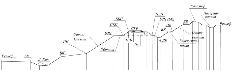 Д. Кан. – дно канавы БК – бровка канавы или кювета ДК – дно кювета ПВ – подошва выемки БВ – бровка выемки