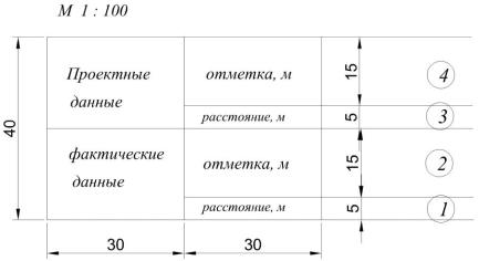 Линии сетки проводятся длиной 50…55 см. Ось пути проводится штрихпунктирной линией по середине чертежа (приложение В). Вдоль оси пути слева пишется: СГР…, … В графу 1 относительно оси влево и вправо выписываются расстояния в масштабе между точками съемки. Над точками съемки в графе 2 располагаются отметки.