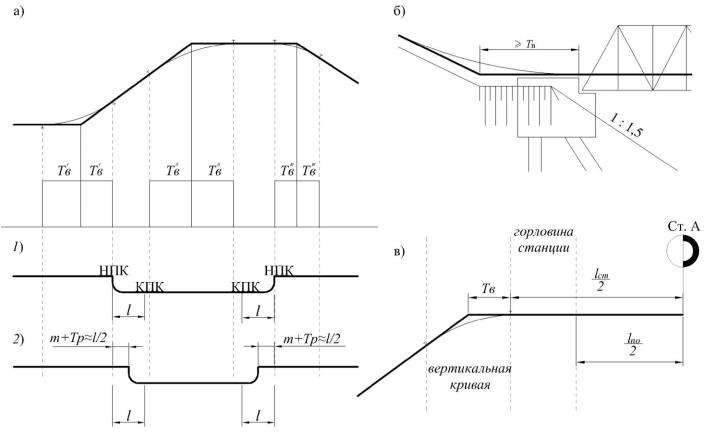 Вертикальные кривые следует размещать вне переходных кривых, стрелочных переводов, а также вне пролетных строений мостов и путепроводов с безбалластной проезжей частью (рис. 4). При этом наименьшее рассто-