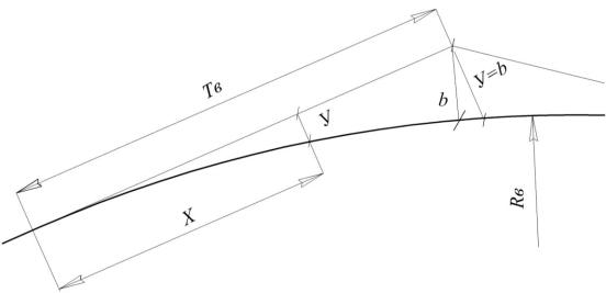 При определении поправки к отметке, в результате устройства вертикальной кривой, принимается допущение – расстояния y (перпендикуляр от элемента профиля до кривой) и b (перпендикуляр от касательной к кривой до перелома профиля) принимаются равными. Для х = Тв: