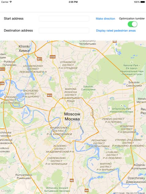 project that represents the main result of this master thesis without doubt will help a lot of people to drive their non-motorized means of transport in Moscow because this city has a lot of tiled pedestrian areas and some other ones are covered by old asphalt with manypatholes.The program helps disabled people and users of kick scooters quickly find comfortable way to any place in Moscow so the final aim is to meet this audience with the application to make their life better.