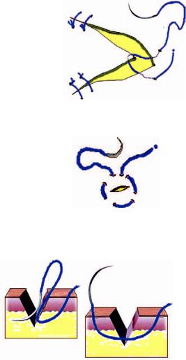 Sutura de esquina: se introduce la aguja a través de la dermis por el lado contrario al colgajo, a unos 0,5 cm de la esquina de la herida (Fig. 9). La aguja se lleva a la punta del colgajo por la hipodermis y se atraviesa la herida hasta salir por la dermis del lado opuesto al punto de entrada. Así, los dos cabos salen al exterior de la herida por la zon a opuesta al colgajo, y es aquí donde se realiza el nudo. En el resto de la herida se usan los puntos discontinuos habituales.