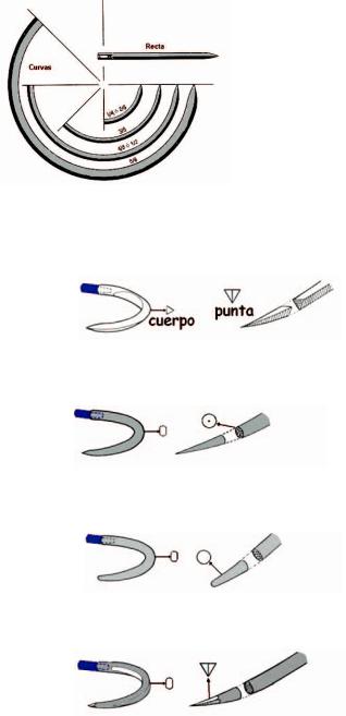 -Las agujas con cuerpo triangular (Fig.2) sirven para coser tejidos resistentes (piel, aponeurosis, músculo).