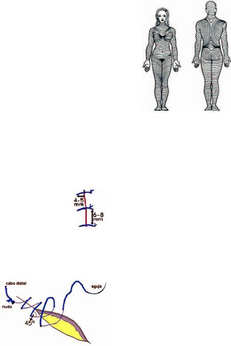 Para cerrar las heridas cutáneas, es conveniente tener en c uenta la o rientación de las líneas d e menor tens ión o lí neas de Langer ( Fig. 6) . Normalmente se corresponden con las arrug as y son perpendiculares a la con tracción de los mús - culos de la región.