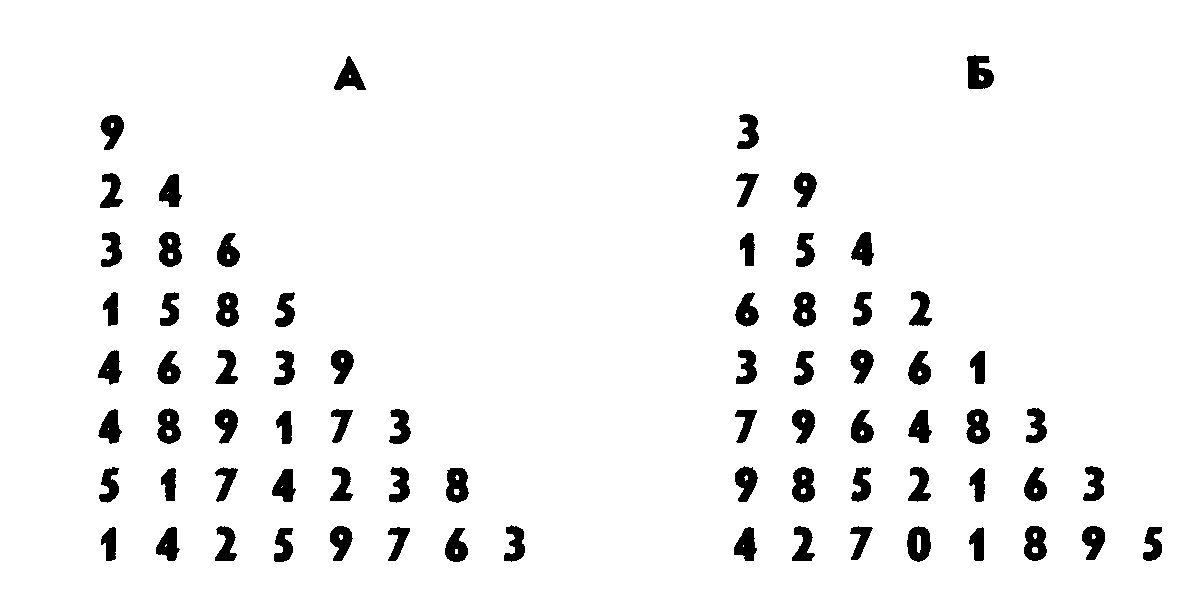 Если ошибка допущена, то экспериментатор повторяет соседний ряд цифр, находящийся справа (рис. 3 Б) и состоящий из такого же количества цифр, как и тот, в котором была допущена ошибка, и просит ребенка его воспроизвести. Если ребенок дважды ошибается в воспроизведении ряда цифр одной и той же длины, то на этом данная часть психодиагностического эксперимента завершается, отмечается длина предыдущего ряда, хотя бы раз полностью и безошибочно воспроизведенного, и переходят к за-читыванию рядов цифр, следующих в противоположном порядке – убывающем (рис. 4 А, Б).