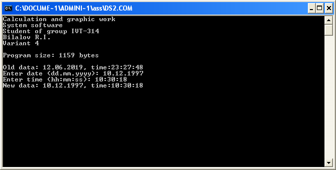В ходе данной расчетно-графической работе были изучены возможности операционной системы MS-DOS и основы системного программирования с помощью ассемблера. В результате разработки данной работы была создана программа, позволяющая изменить дату и время создания файла MYFILE.txt и вывести их старые и новые значения.