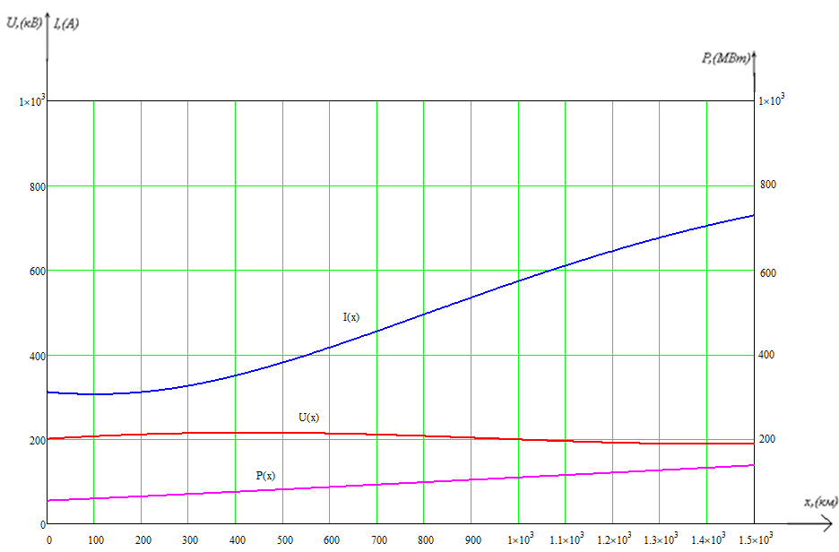 б) изменяя координату x от 0 до 1500 рассчитать распределение вдоль линии действующих значений напряжения U(x) и тока I(x), а также активной мощности P(x);