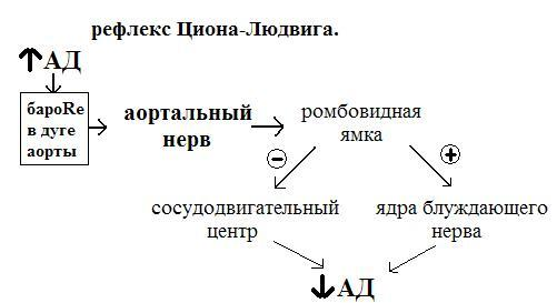 Глазосердечный (Даньини–Ашнера) рефлекс. Надавливание на глазные яблоки вызывает раздражение рецепторов тройничного нерва; импульсы передаются по этому нерву в средний мозг, далее по вставочному нейрону (возможно, по волокнам ретикулярной субстанции) направляются к ядрам блуждающих нервов, от которых импульсы доходят до нервных сплетений сердца. Кроме того, надавливание на глаза приводит к изменению внутриглазного давления и раздражению барорецепторов полостей глаз, импульсы от которых передаются в ствол мозга к ядрам блуждающих нервов.