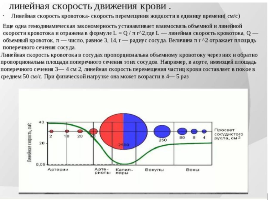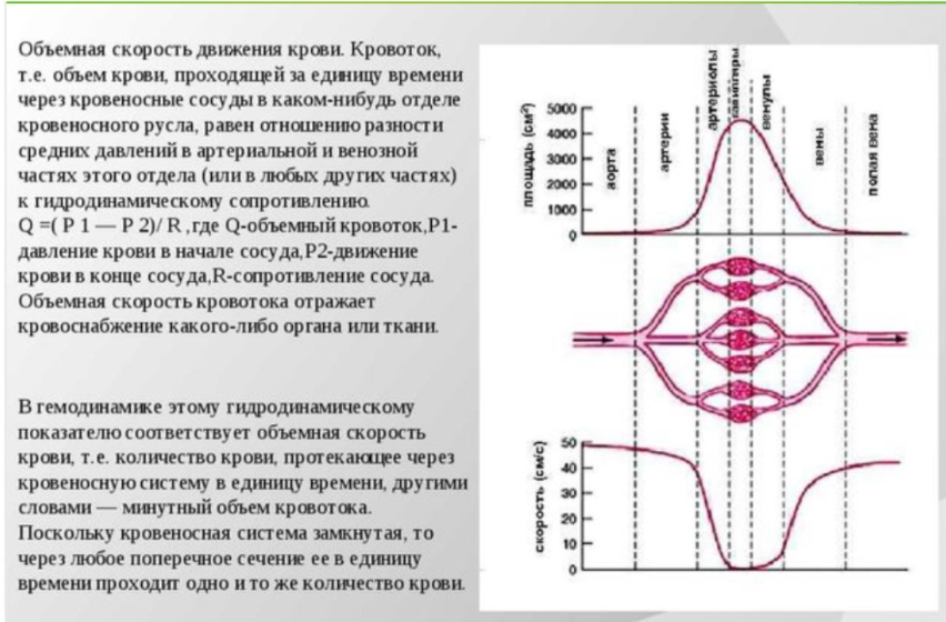 Движение кровотока по сосудистому руслу изучает гемодинамика. В ходе исследований выявлено, что данный процесс является непрерывным в организме человека вследствие разницы давления в сосудах. Прослеживается течение жидкости от участка, где оно высокое, к участку с более низким. Соответственно, имеются места, отличающиеся наименьшей и наибольшей скоростью течения.
