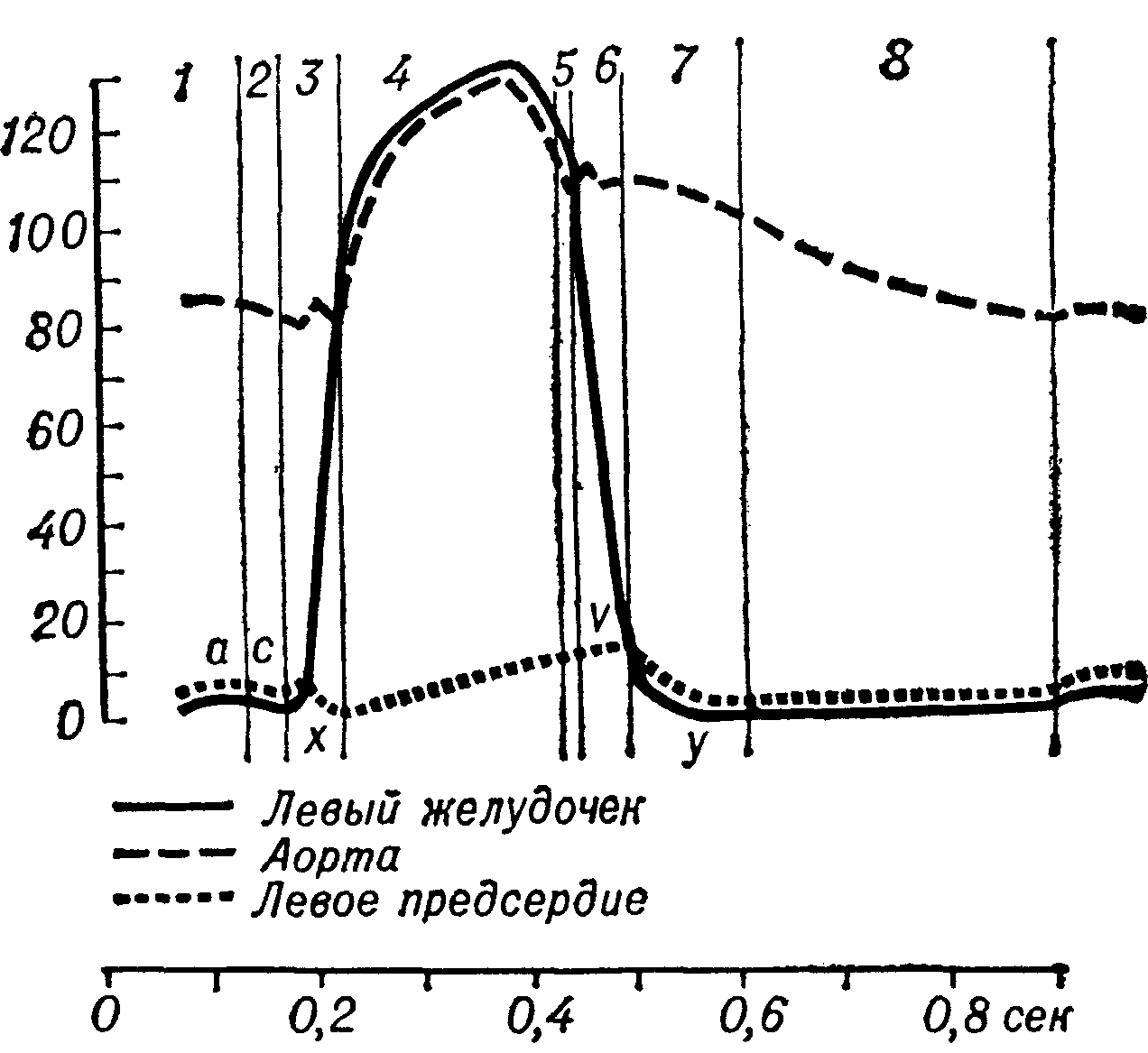 Изменение давления в аорте, левом желудочке и левом предсердии в процессе сердечного цикла: 1 — фаза наполнения, обусловленная систолой предсердий; 2 — фаза асинхронного сокращения; 3 — фаза изометрического сокращения; 4 — фаза изгнания; 5 — протодиастолический период; 6 — фаза изометрического расслабления; 7 — фаза быстрого наполнения; 8 — фаза медленного наполнения; а, с, x, v и у — волны внутрисердечного давления: а — развивается во время систолы предсердий; с — возникает в момент закрытия атрио-вентрикулярных клапанов; x — связана с расслаблением миокарда предсердий; v — обусловлена притоком крови из легочных и полых вен; у — развивается в начале диастолического наполнения желудочков. По оси ординат —величина давления. Внизу — отметчик времени.