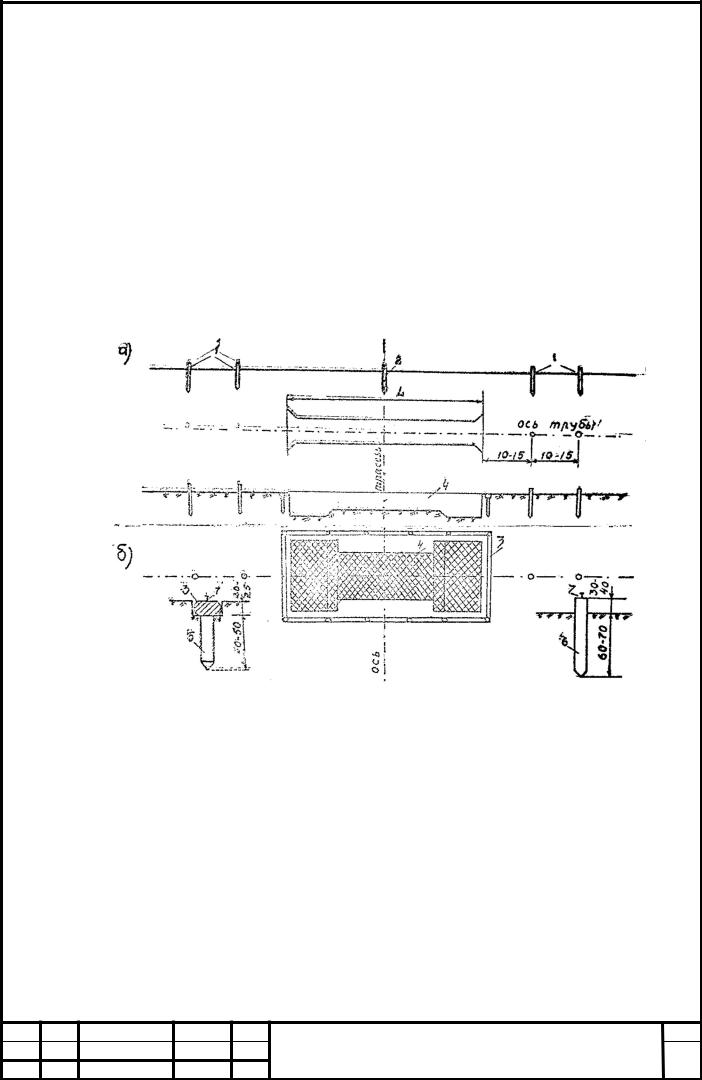 Входе подготовительных работ геодезисты на обходе производят разбивку трубы. Положение трубы определяется проектом. Проектная организация должна закрепить в натуре и сдать по акту производителям работ точку пересечения оси дороги с продольной осью трубы, продольную ось трубы, закрепленную четырьмя выносными кольями (рис. 1, а), а также высотный репер.