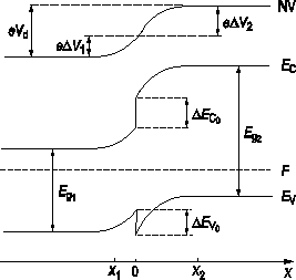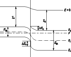 Після розрахунку вказаних фізичних величин приступити до побудови зонної діаграми гетеропереходу в рівноважному стані. При цьому врахувати, що при приведені напівпровідників у контакт, положення рівня Фермі у матеріалах стає однаковим (рис.5).