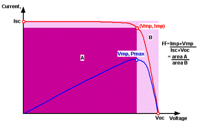 де Рs – потужність сонячного випромінювання, що падає на сонячний елемент; FF – фактор заповнення ВАХ (коефіцієнт форми ВАХ), який дорівнює (рис. 6).