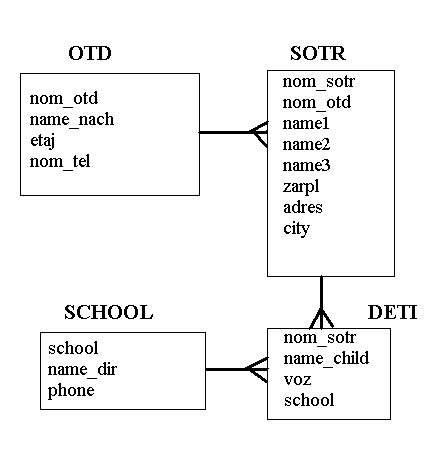 таблица сотрудников SOTR с первичным ключом nom_sotr и внешним ключом nom_otd и полями: