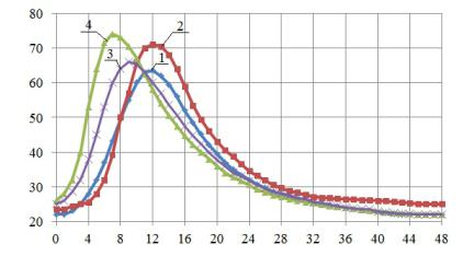Fig. 5 shows that hydromechanochemical cement activation increases the hydration temperature by 20––25 °С accompanied with a 4––5 hour shift of the temperature maximum to the left, which makes cement hydration more intense. As Relamix Т-2 is introduced, the hydration of the cement paste slows down in the first hours (composition № 2) accompanied by a 2 hour shift of the temperature maximum.